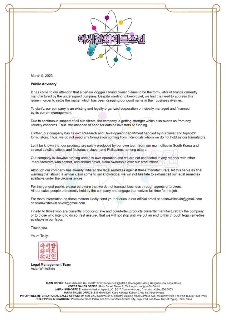 Public Advisory - Certain Vlogger / Brand Owner Claims to be the Formulator of Brands Currently Manufactured by the Undersigned Company — Asianwhiteskin アジアの白い肌